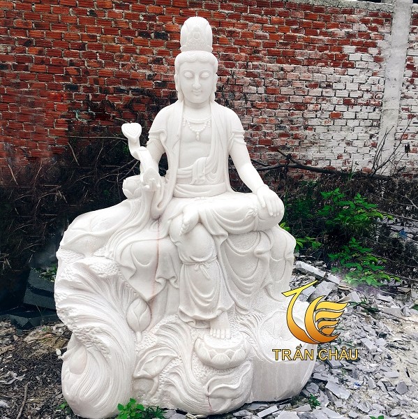 Tượng Phật Quán Tự Tại Bồ Tát Ngồi Trên Đài Sen Đá Trắng Nguyên Khối
