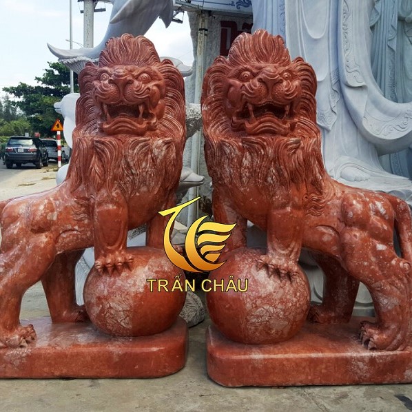 Tượng Sư Tử Đá Granite Đỏ Đứng Trên Bi Đá